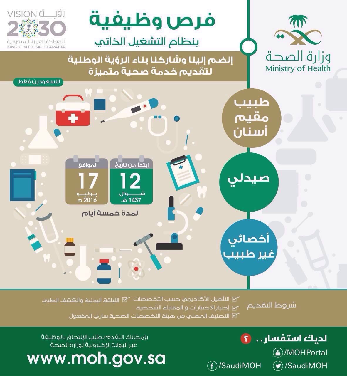 و ز ا ر ة ا لـ صـ حـ ة السعودية On Twitter وزارة الصحة تعلن عن توفر ١٢٥٥ وظيفة شاغرة على نظام التشغيل الذاتي
