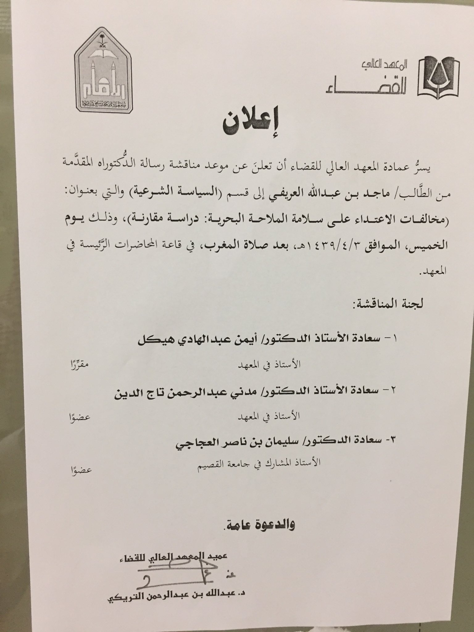 د سلطان العريفي On Twitter أبارك لأخي وابن عمي وصديق عمري المستشار في الديوان الملكي ماجد بن عبدالله العريفي حصوله اليوم على درجة الدكتوراه من المعهد العالي للقضاء أنت من شرف الدرجة