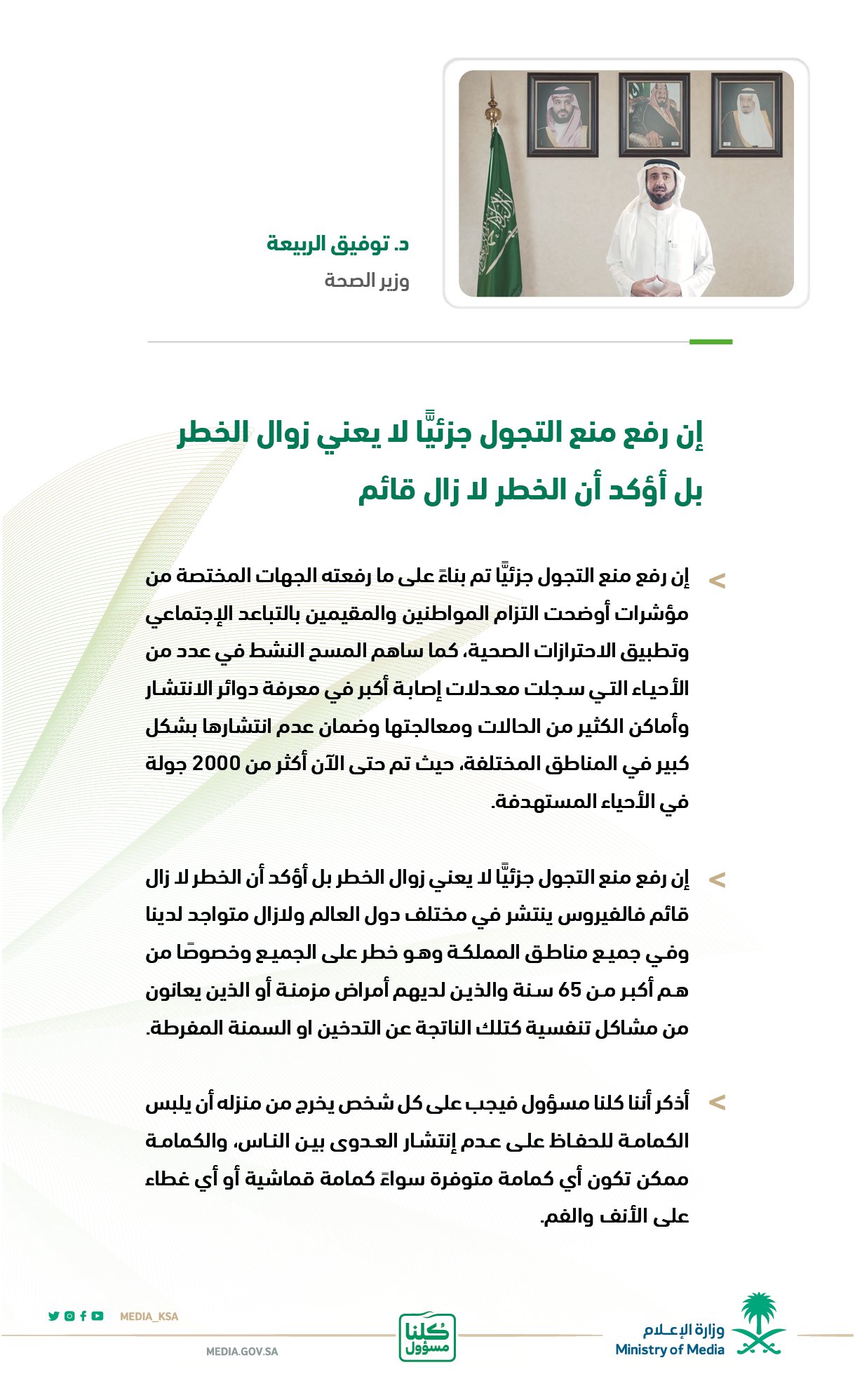 وزارة الإعلام On Twitter كلنا مسؤول إن رفع منع التجول جزئيا تم بناء على ما رفعته الجهات المختصة من مؤشرات أوضحت التزام المواطنين والمقيمين بالتباعد الاجتماعي وتطبيق الاحترازات الصحية من كلمة وزير