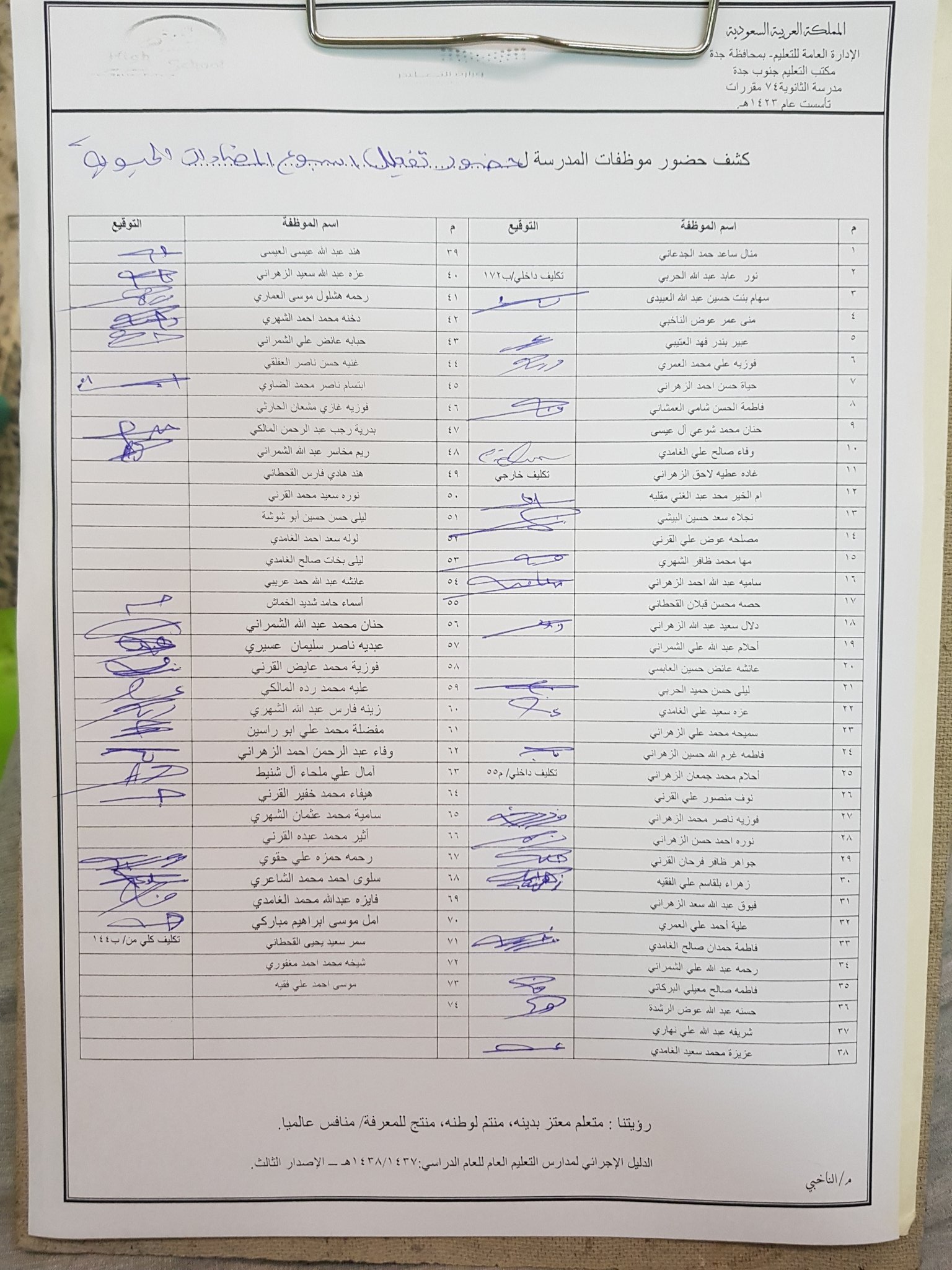 سجل حضور وانصراف الموظفات حسب الدليل الاجرائي الاصدار الثالث 1437 هـ المدرسة السعودية